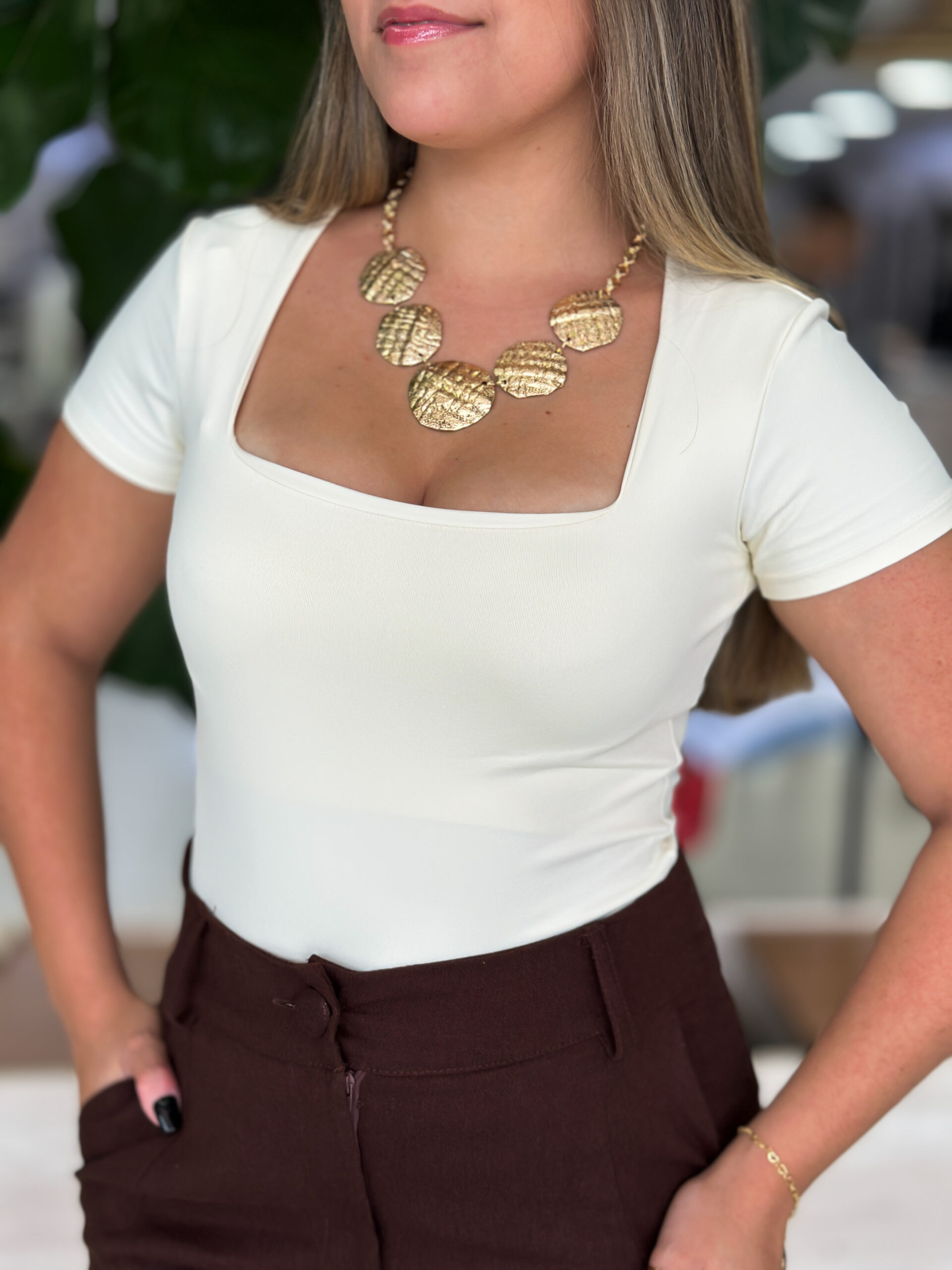 - Decote levemente quadrado;